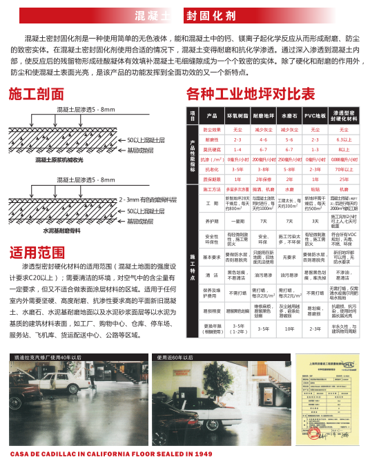 根據不同的使用功能需求、現場施工條件、地域差異等因素,公司主要涉及產品分為:混凝土密封固化劑系列、環氧樹脂地坪漆涂裝系列、PVC卷材系列、運動球場涂裝系列、停車場交通標識系列、巖棉保溫防火復合板外保溫系列等。